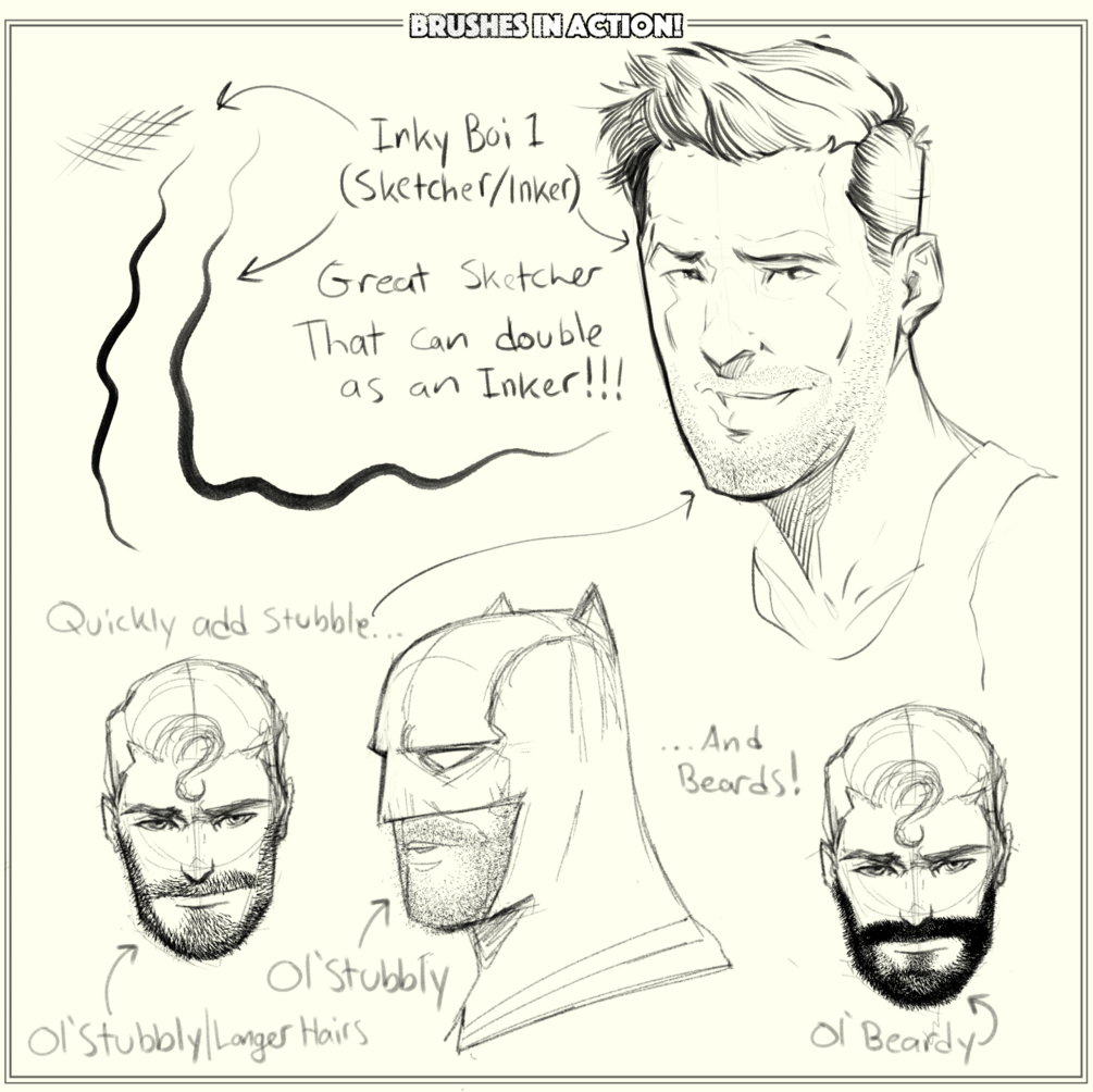 This brush pack for Clip Studio Paint contains my Inky Bois, Wavy Hatchers, Hair, Feathers, and Fur brushes. These brushes are perfect for sketching, inking, adding some unique textures, and hatching to different areas of your work, and giving you quick ways to add things like curly hair and stubble to different characters you're drawing. Carefully crafted and tested over many hours to make sure that they look and feel just right to get you the look you want while being fun to use.