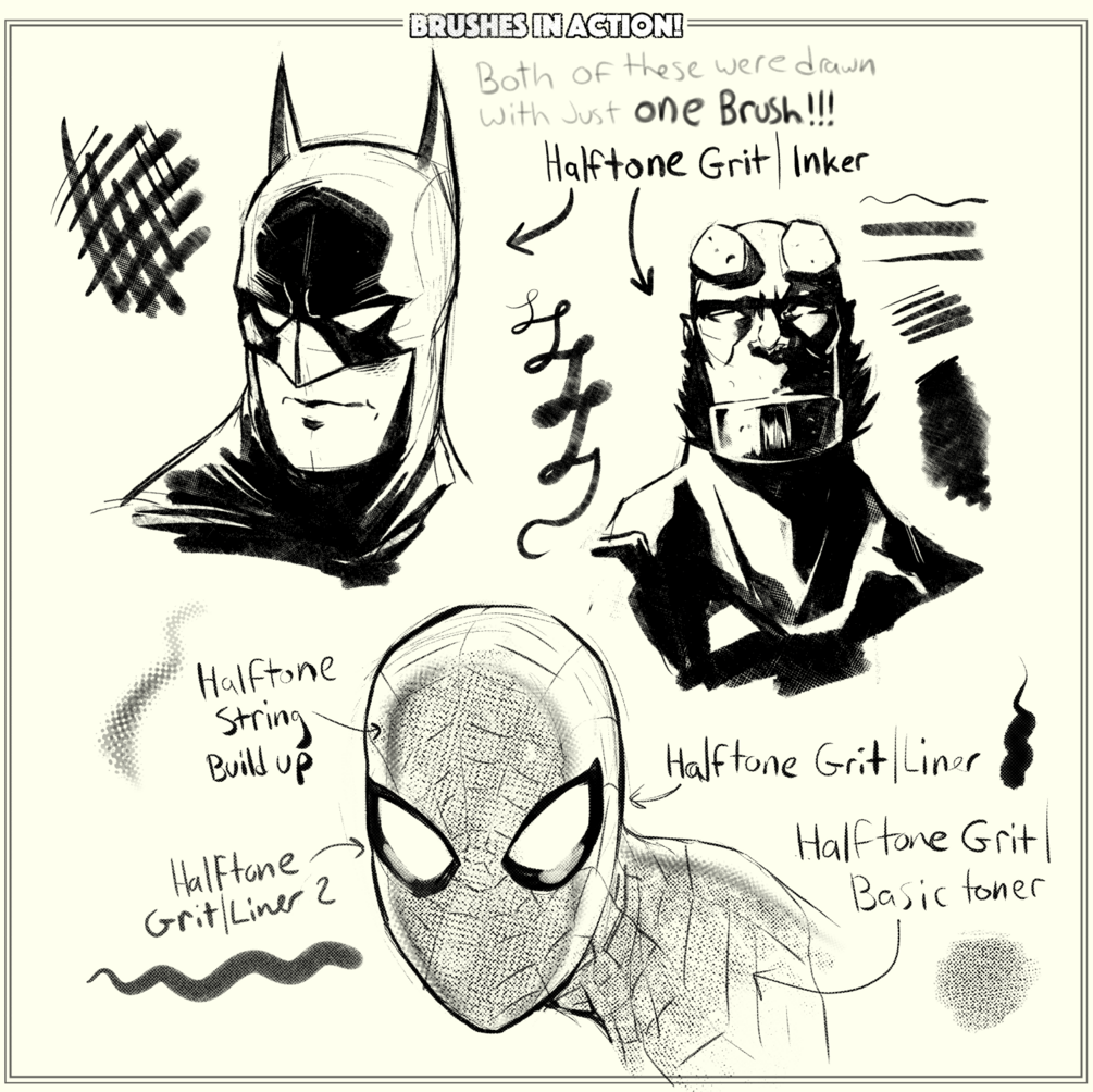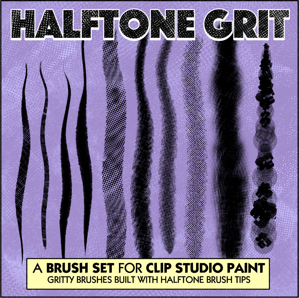 This brush pack for Clip Studio Paint contains my Halftone Grit Brushes. These brushes are perfect for sketching, inking and adding some unique textures to different areas of your line work, shadows, spot blacks, and/or colors! Carefully crafted and tested over many hours to make sure that they look and feel just right, to get you the look you want while being fun to use.