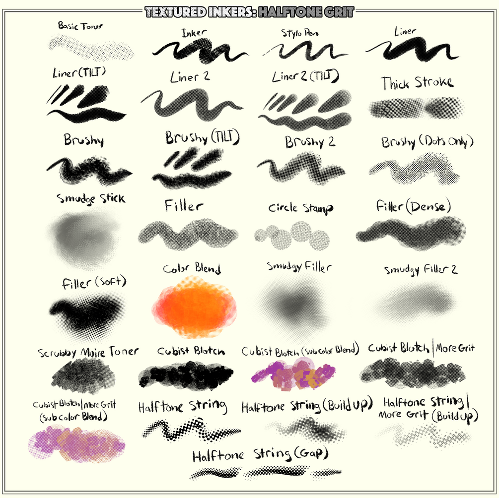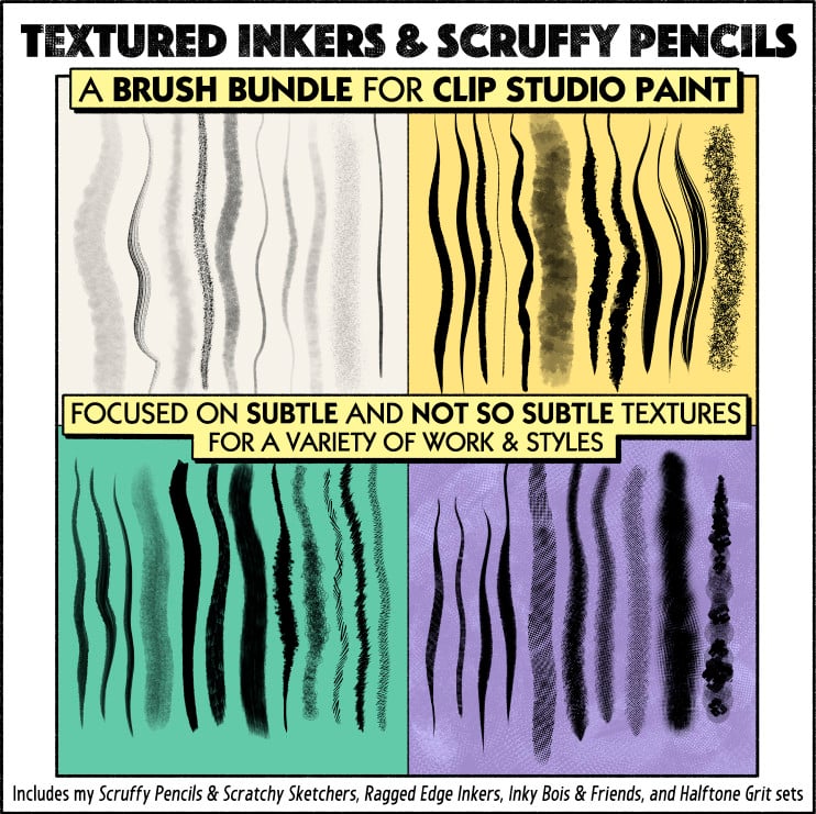 This brush bundle for Clip Studio Paint includes my Scruffy Pencils & Scratchy Sketchers, Ragged Edge Inkers, Inky Bois & Friends, and Halftone Grit sets, at a discount! Plus you'll get all updates and additions for free for the life of the set(s).
