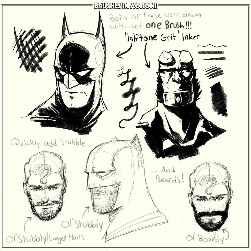 These brushes are perfect for inking, sketching, or adding some unique textures to different areas of your work. If you've been looking for a brush set to help give your work a bit of a traditional tooth and texture, this is the set for you. Carefully crafted and tested over many hours to make sure that they look and feel just right to get you the look you want, while being fun to use.