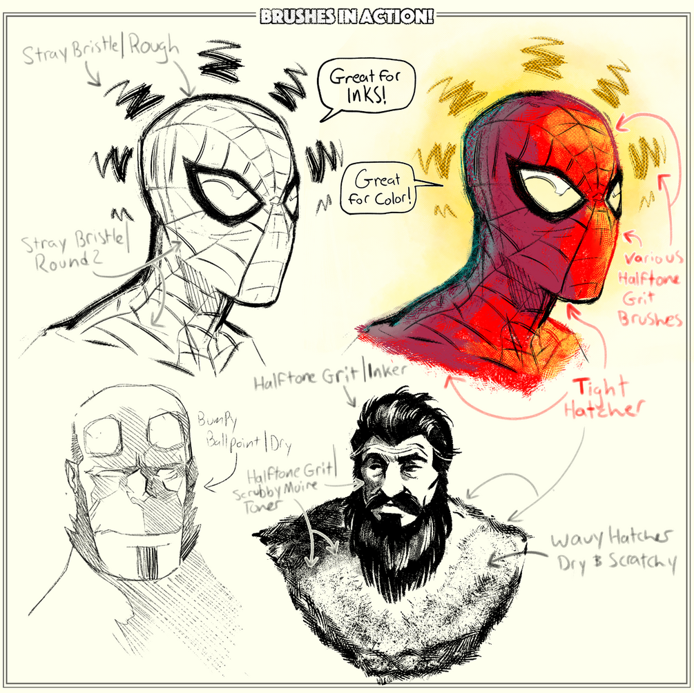These brushes are perfect for inking, sketching, or adding some unique textures to different areas of your work. If you've been looking for a brush set to help give your work a bit of a traditional tooth and texture, this is the set for you. Carefully crafted and tested over many hours to make sure that they look and feel just right to get you the look you want, while being fun to use.