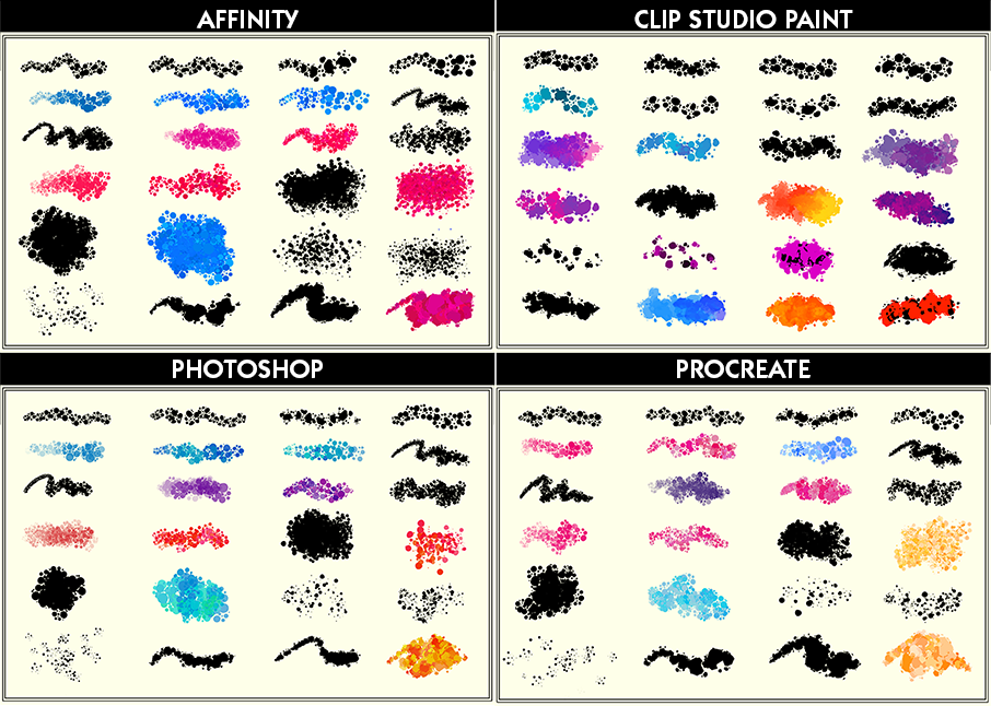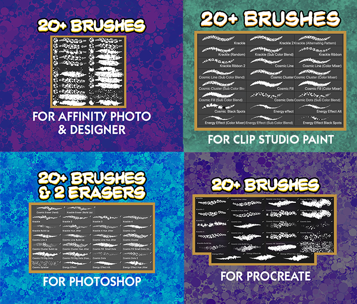 Includes brushes for all Kirby Krackle sets. (Affinity, Clip Studio Paint, Photoshop, and Procreate)